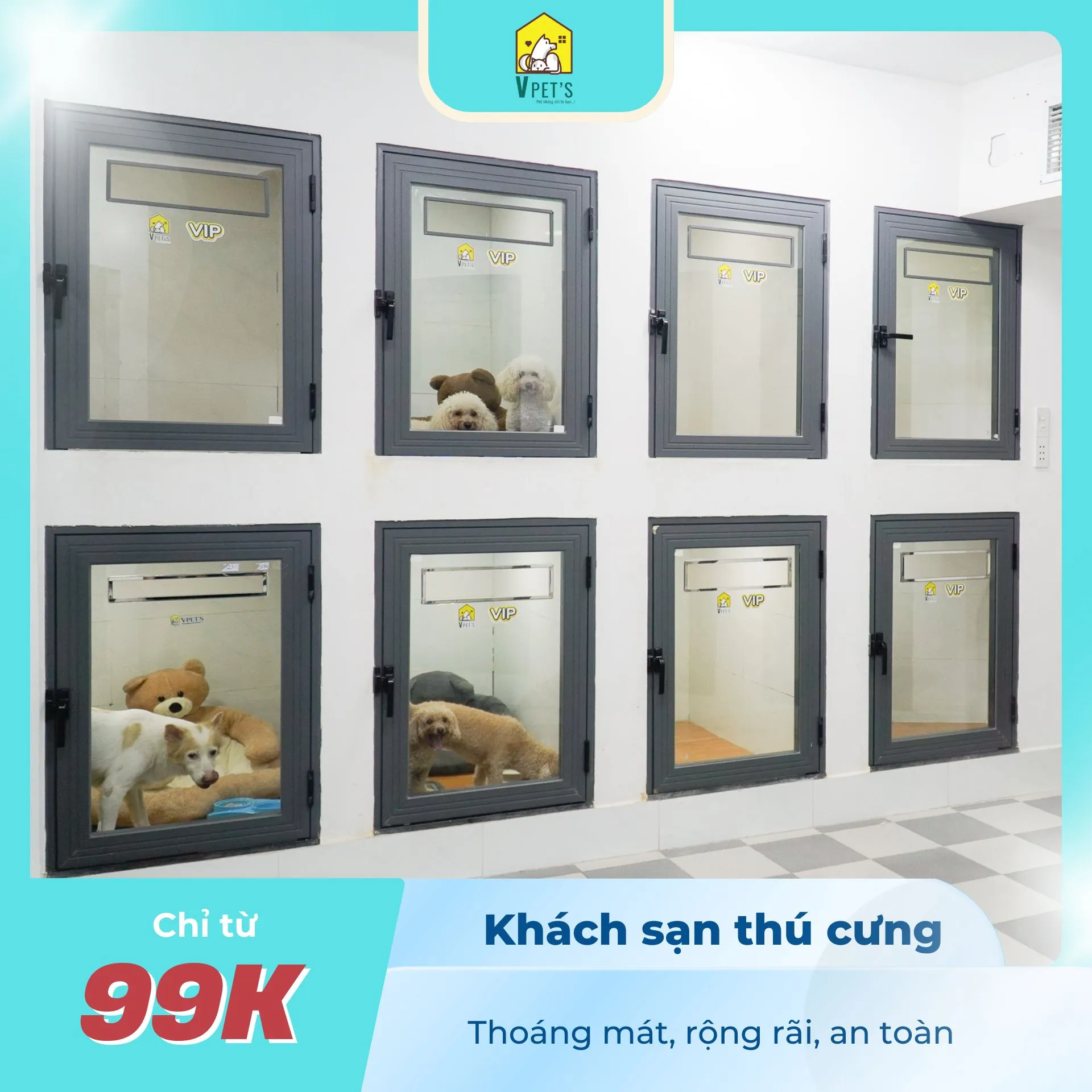 Tại đây, chúng tôi mang đến hệ thống phòng nghỉ hiện đại, luôn được duy trì nhiệt độ mát mẻ và khử trùng định kỳ để đảm bảo môi trường sống sạch sẽ, ngăn ngừa tuyệt đối các mầm bệnh truyền nhiễm. Khác với việc bị gò bó trong lồng chật hẹp, các bé tại VPet’s sẽ có không gian vận động riêng, được vui chơi và tương tác cùng các nhân viên tận tụy.